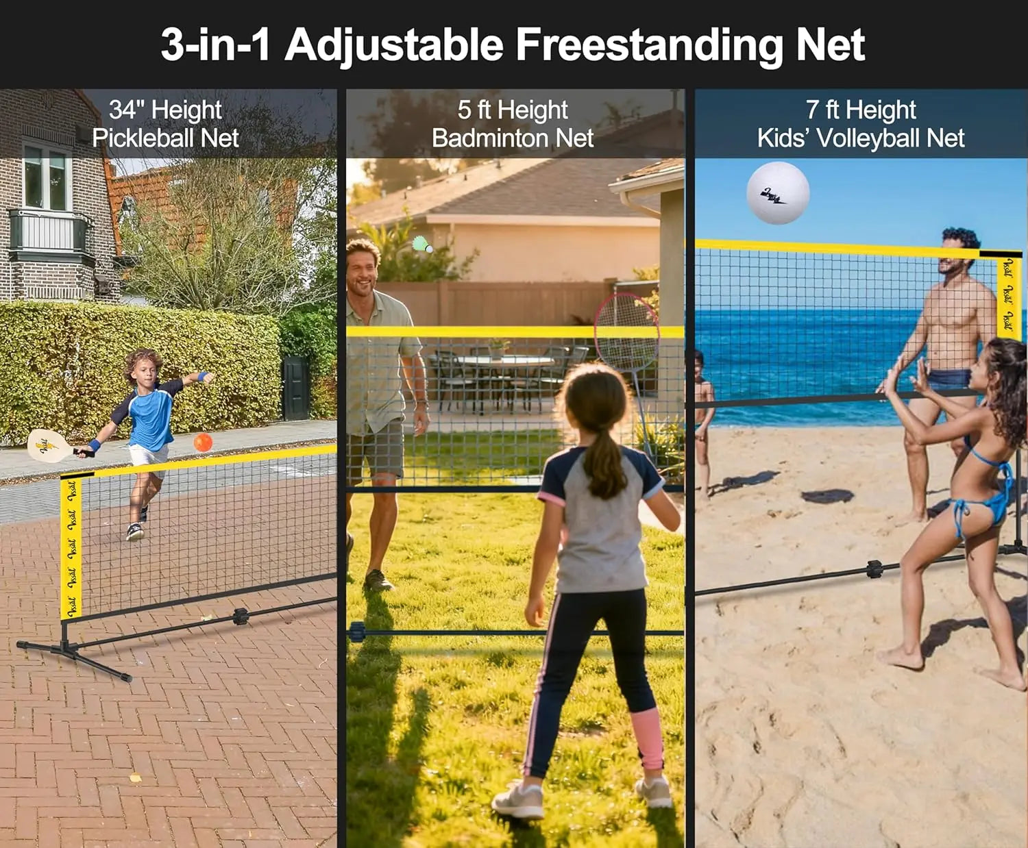 This versatile sports set offers everything you need for fun outdoor activities in one convenient package. It includes a durable net, multiple rackets and paddles, balls, and a carrying bag for easy transport. Key Features: - Multi-Sport Design: The set supports badminton, volleyball, and pickleball with an adjustable net that ranges from 34 inches to 10 feet in height. This flexibility makes it suitable for players of all ages and skill levels, from children's games to adult competitions. - Complete Accessories: You'll receive a 10-foot wide PE net, four badminton rackets with three birdies, two pickleball paddles with four balls, a PU volleyball with a pump, steel poles with stakes for stability, and a premium carrying bag. Everything is included to start playing right away without additional purchases. - Easy Setup and Portability: The freestanding base poles connect quickly using a thickened bungee cord for fast assembly. EVA foam clamp pads lock the poles securely in place during use and fold out easily for storage. The net attaches via side sleeves for hassle-free installation. A heavy-duty carrying bag holds the entire set without deflating the volleyball, making it perfect for trips to the beach or camping. - Durable Construction: Made from premium steel with rust-resistant coating and tear-resistant PE netting, this set is built to last through frequent use in various outdoor conditions. It comes with a lifetime warranty to ensure long-term satisfaction. Ideal Uses: Perfect for family gatherings in backyards or parks where multiple sports can be enjoyed together. Great as a gift for outdoor enthusiasts who appreciate versatility and convenience in their recreational equipment